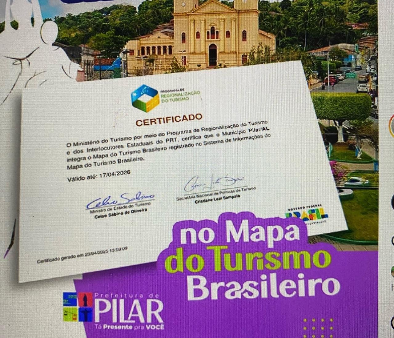 Mais uma vez, o município do Pilar está oficialmente no Mapa do Turismo Brasileiro. “Esta semana, recebemos uma certificação do Ministério do Turismo que reconhece nosso potencial. Essa conquista não apenas valida nossos esforços, mas também abre novas portas para investimentos e ações promocionais, além de garantir um crescimento sustentável para a nossa região”, comemora a prefeita Fátima Rezende (MDB).