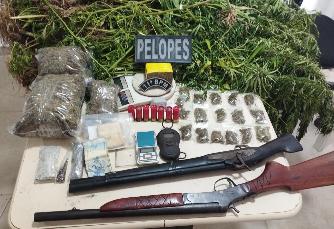 Durante a varredura no local, diversos pés de maconha foram apreendidos, além de entorpecente embalado pronto para venda, armas de fogo, balanças de precisão e uma quantia em dinheiro trocado.