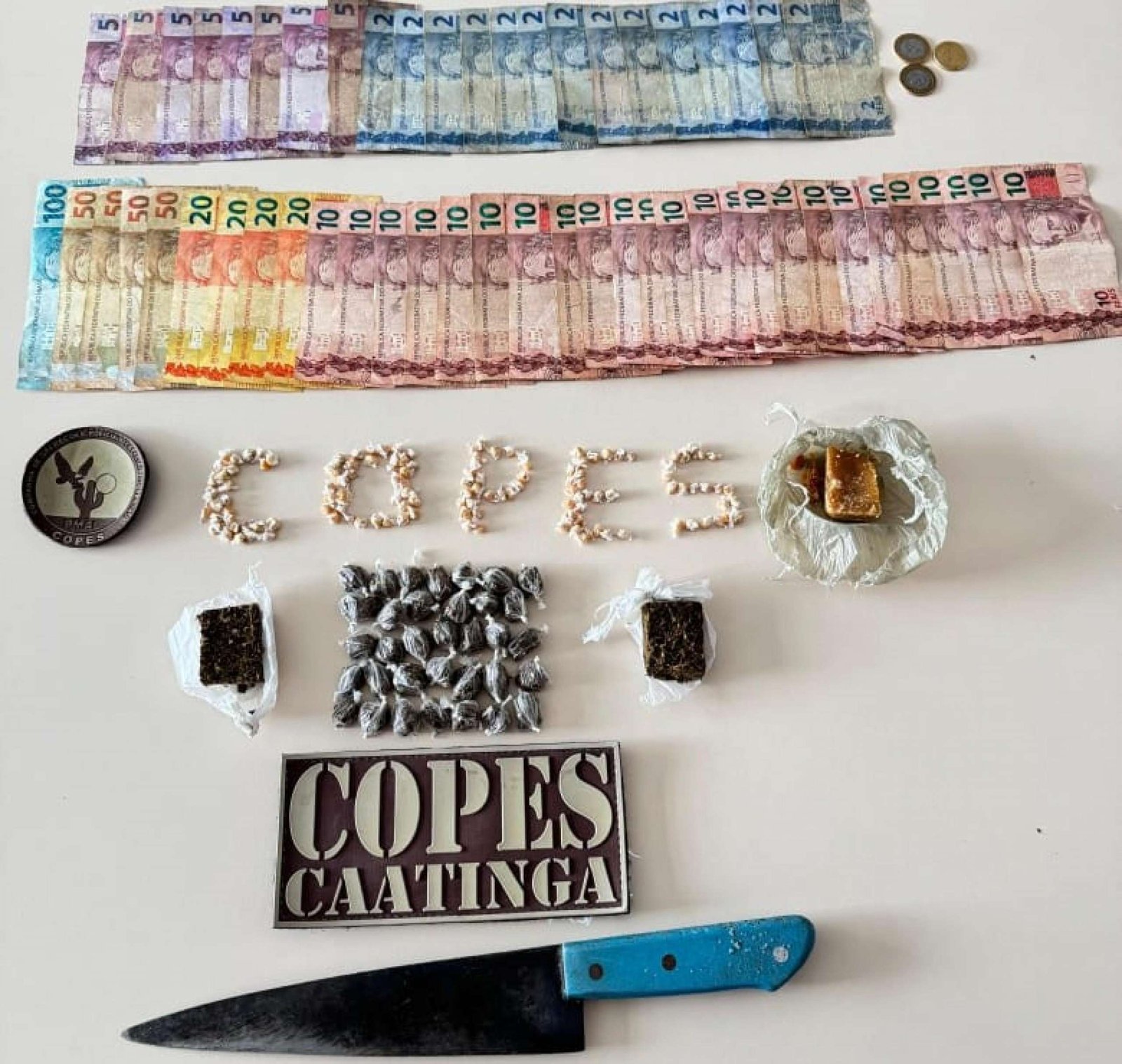 Durante a abordagem, foi encontrada com o menor uma faca na cintura, além da maior parte do material ilícito e o dinheiro. Já com o homem, os policiais encontraram 11 gramas de maconha prensada. Ambos foram levados inicialmente à Unidade de Pronto Atendimento (UPA) para a confecção do laudo médico e, em seguida, conduzidos ao Centro Integrado de Segurança Pública (Cisp) de Delmiro Gouveia, onde foram adotadas as medidas legais cabíveis.