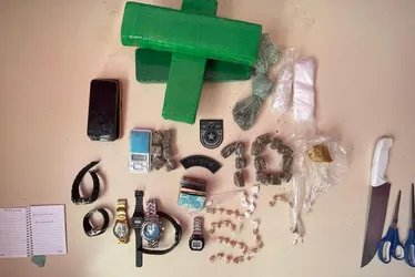 Também foram recolhidos materiais relacionados ao tráfico, como uma balança de precisão, uma faca tipo peixeira, duas tesouras, bolsas plásticas e uma caderneta de anotações. Além disso, os policiais apreenderam a quantia de R$1.072,40 em espécie, sete relógios de pulso e três celulares.