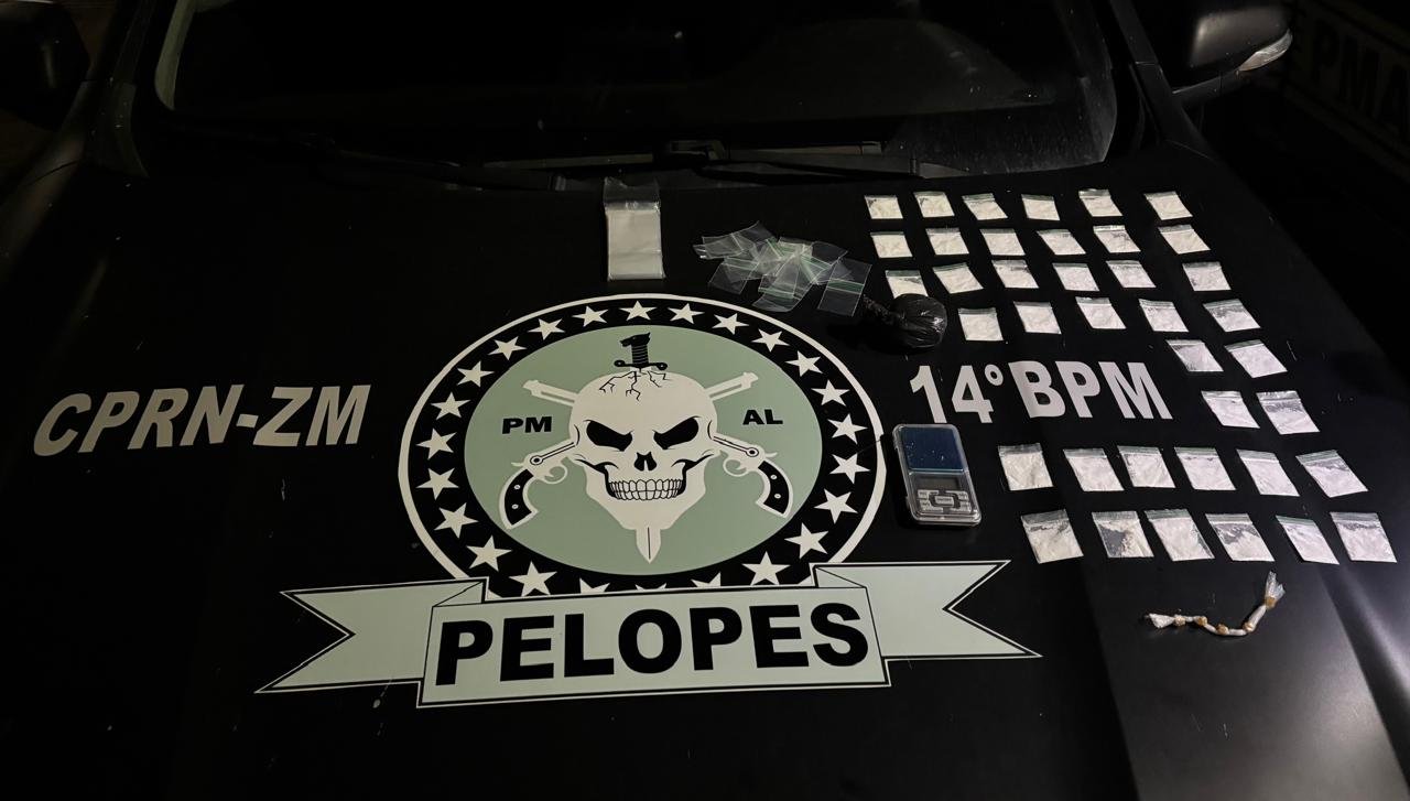 Na manhã do mesmo dia, no município de Joaquim Gomes, no bairro Cacimbas, o 14º BPM apreendeu 3g de maconha, 5g de cocaína e um pacote de papel seda com uma mulher de 19 anos. O Pelopes realizava diligências em ações de combate ao tráfico na região quando se deparou com a suspeita. Ela admitiu que portava substância entorpecente. Confirmada a ilicitude, foi lavrado um Termo Circunstanciado de Ocorrência (TCO).