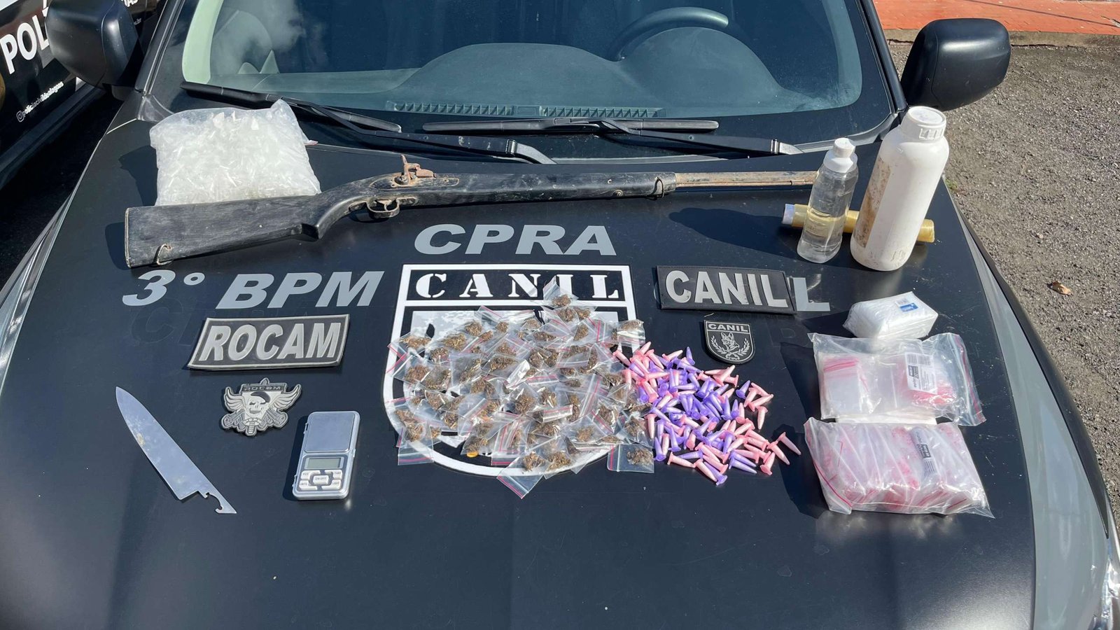 Chegou ao conhecimento da PM que indivíduos estariam fracionando drogas e escondendo o material em uma área de mata, no final de uma localidade conhecida como Rua do Amor. Na chegada, um indivíduo notou a presença da polícia e foragiu pela vegetação. As equipes realizaram buscas na região, inclusive com o emprego dos cães farejadores K9 Luna e Beretta. Foi encontrado um balde contendo parte dos itens ilícitos. A arma foi localizada em outro ponto da mata.