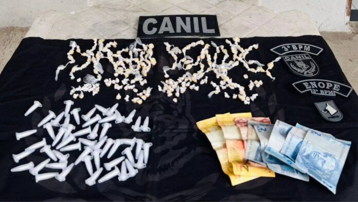 Mais entorpecentes foram encontrados em outra abordagem, no bairro Canafístula. Os militares realizavam patrulhamento pelo local quando avistaram uma dupla consumindo drogas em um terreno baldio. De imediato, os militares interceptaram os rapazes e realizaram a busca pessoal. Um dos homens revelou ser usuário, enquanto o outro assumiu ser o responsável pelo comércio da droga.