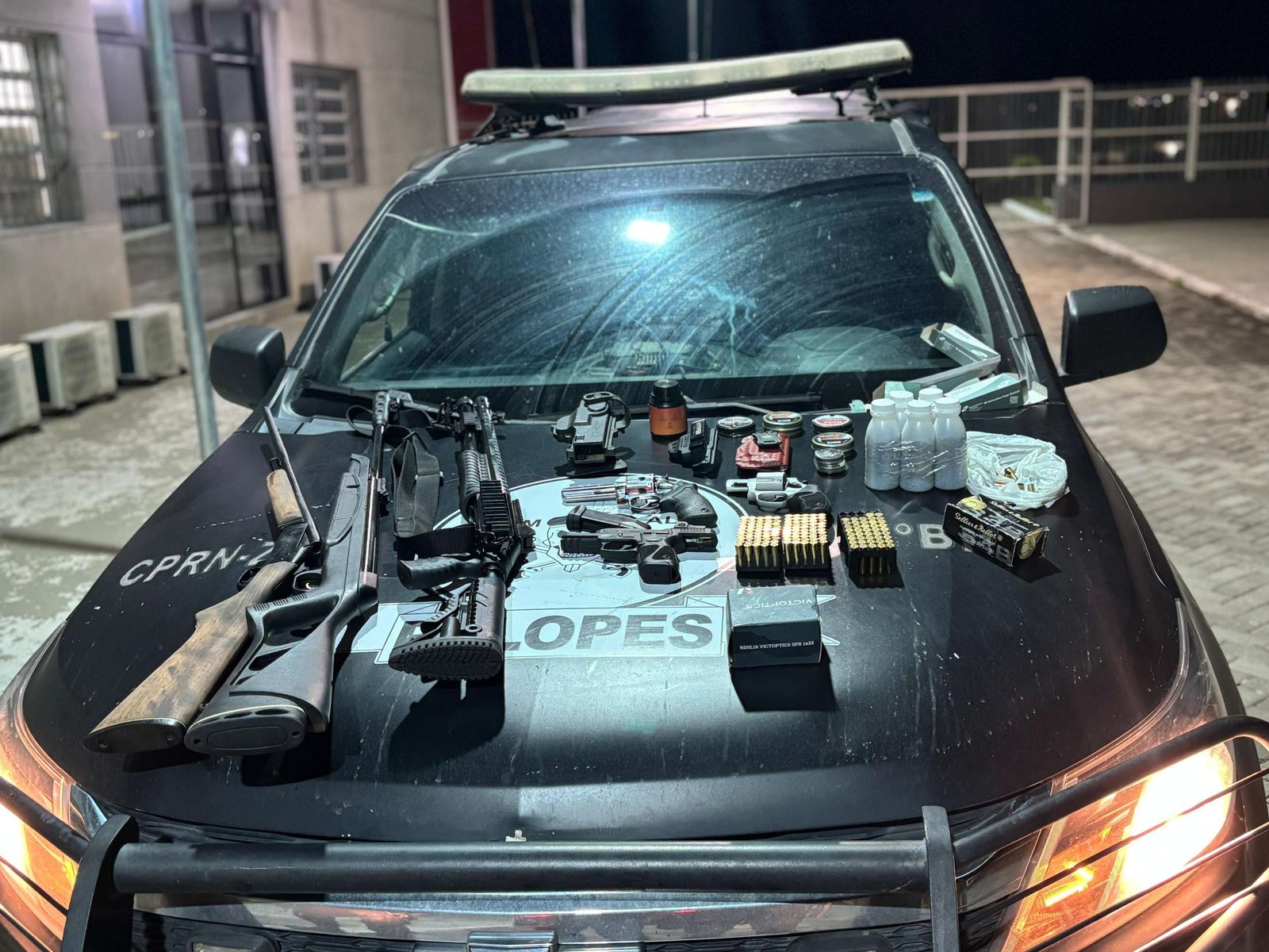Equipes foram até o Centro da cidade para dar cumprimento a mandados de busca, apreensão e prisão temporária. A ação resultou na apreensão de um verdadeiro arsenal composto por uma pistola 9mm, dois revólveres (sendo um calibre 357 e outro, 38), duas espingardas (calibre 12 e 36), uma espingarda de pressão, uma mira ótica de pistola, estojos e munições de calibres diversos, cinco garrafas de chumbo, espoleta, pólvora e um cofre.
