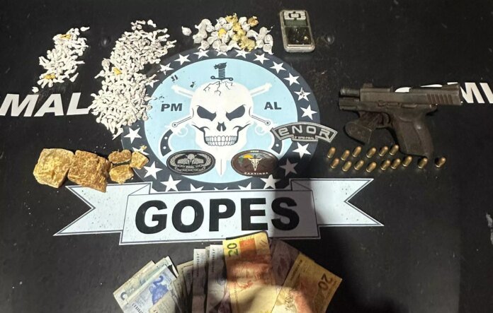 A 10ª Companhia de Polícia Militar Independente (CPM/I) deteve, no município de Teotônio Vilela, duas mulheres por envolvimento com o tráfico de drogas. Na ação, foram apreendidos: uma pistola calibre 380 com 15 munições intactas; uma balança de precisão; 34 bombinhas de maconha (26 gramas); 220 pedrinhas de crack (47 gramas) e quatro pedras maiores da mesma droga (191 gramas), além de R$117 reais.
