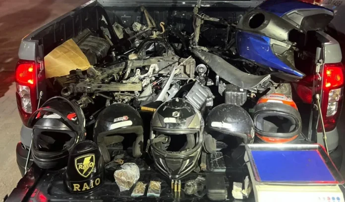 Durante a averiguação, foram encontrados três chassis de motocicletas com queixa de roubo, carenagens e capacetes. Além disso, cerca de 250 gramas de maconha e uma balança de precisão também foram apreendidos.