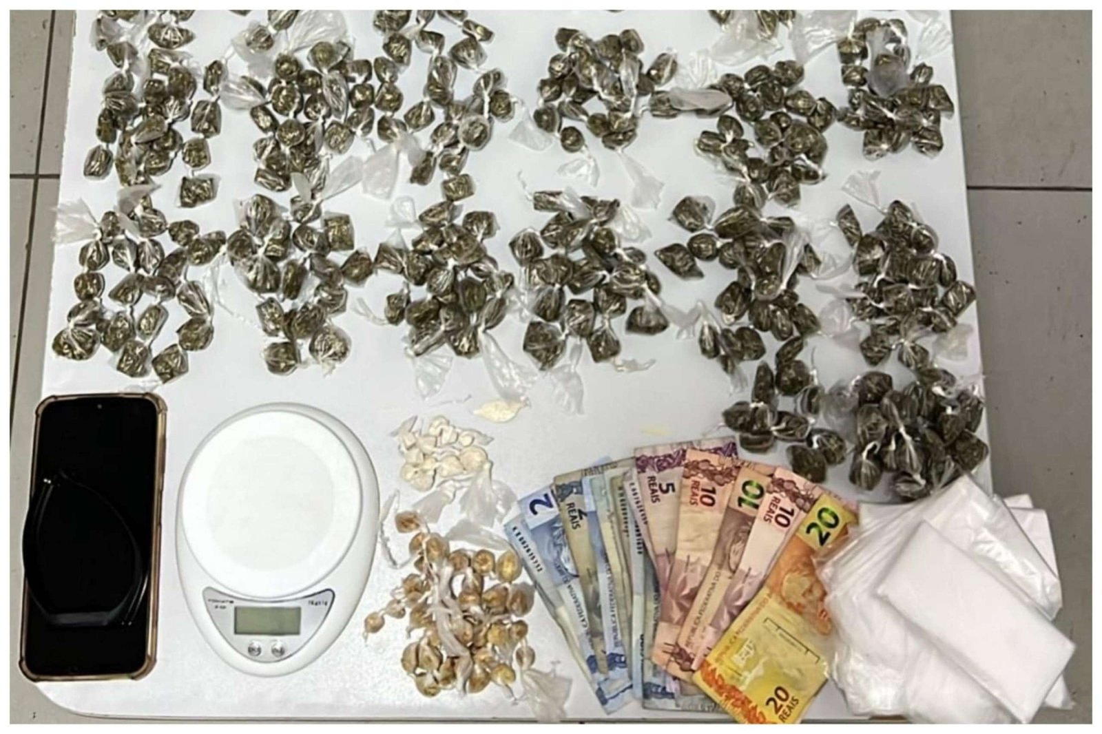O suspeito recebeu vozde parada e uma busca pessoal foi feita. Com ele, os policiais encontraram 468 gramas de maconha, 27 gramas de crack e sete gramas de cocaína, além de uma balança de precisão e R$ 220 em dinheiro.