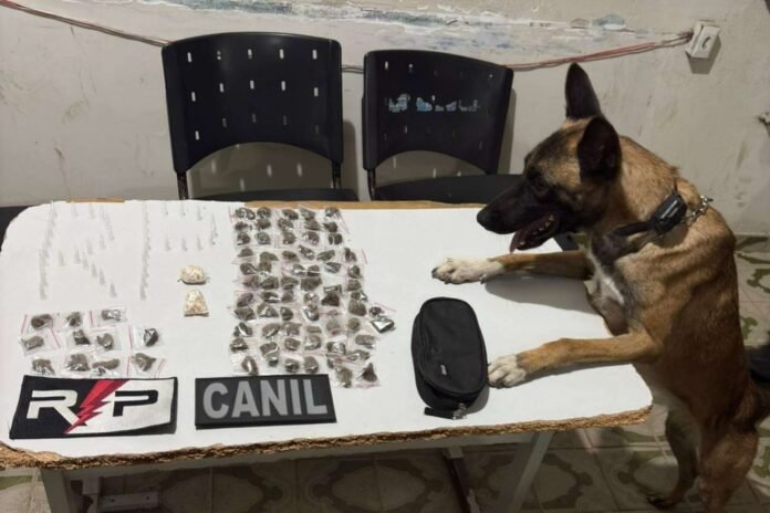 No imóvel, o suspeito foi abordado, alegando que estaria no local para retelhar a casa. Havia, porém, um forte odor de maconha no imóvel. Nas buscas, uma quantidade foi encontrada. Dando continuidade, com apoio do Canil, a cadela K9 Luna, encontrou mais drogas. Havia aproximadamente 15g de maconha, 14g de crack e 20g de cocaína escondidos em um estojo escolar escondido junto ao muro nos fundos da casa.