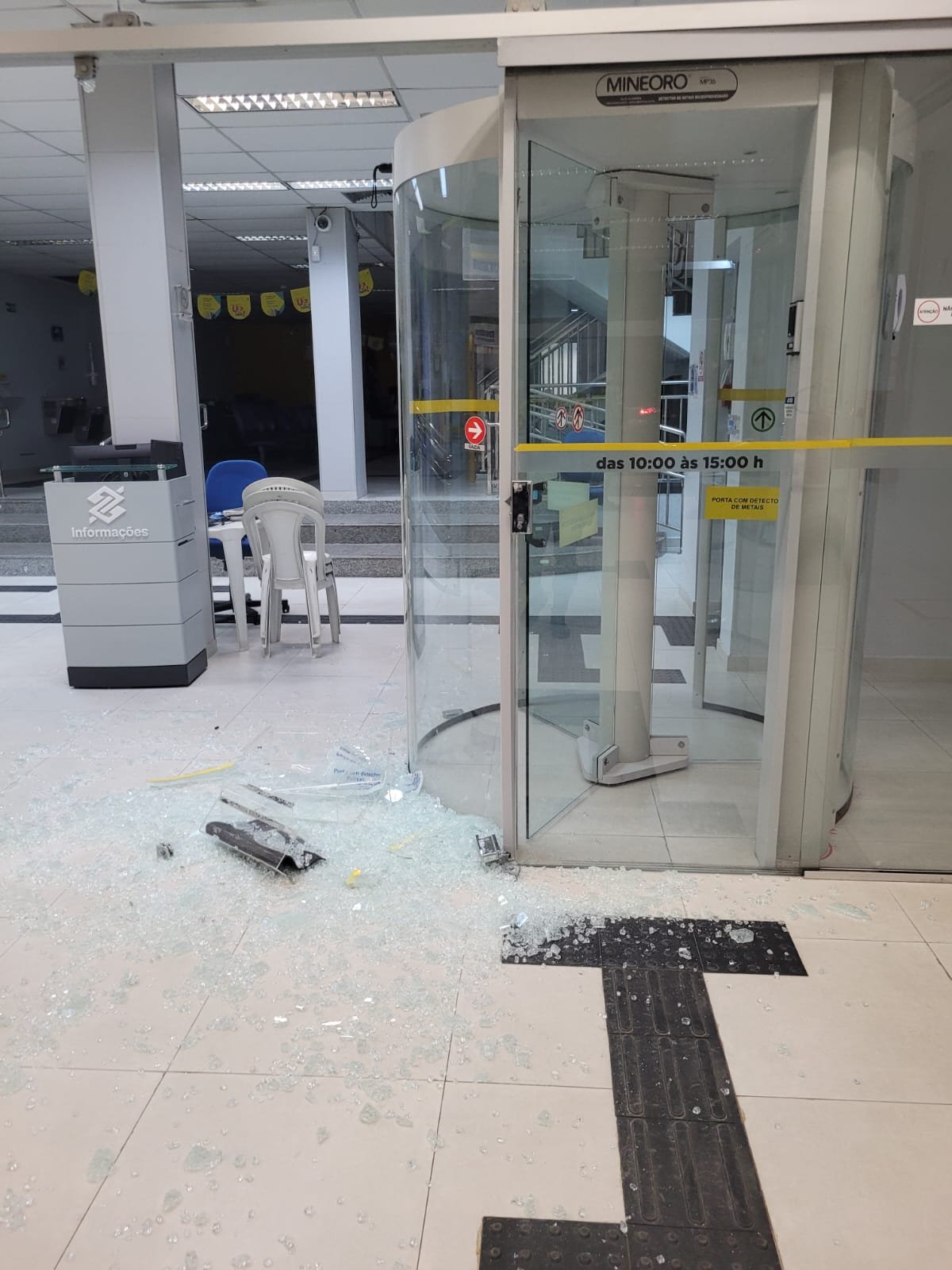 As informações apontavam que um homem usando calça e camisa amarela abriu a porta da entrada com um chute e usou um extintor de incêndio para danificar a outra porta. Em seguida, ele teria se escondido dentro da agência.