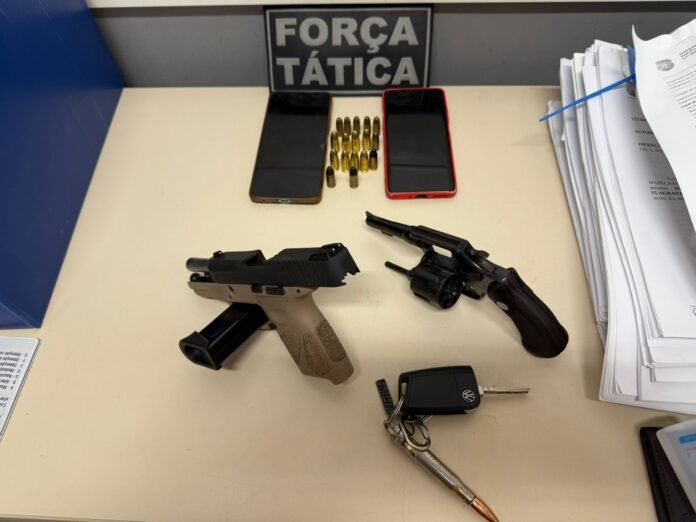 Durante a revista no veículo, foram encontradas uma pistola G2C calibre 9mm com 11 munições e um revólver calibre 32 com seis munições sendo 02 delas pinadas.