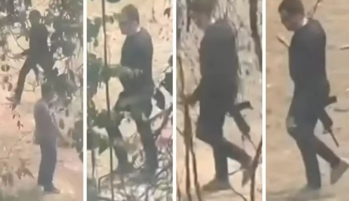Montagem mostra trechos do vídeo em que policial civil que atirou em trabalhadores de obra caminha com arma de grosso calibre após cometer o crime, nesta sexta-feira (18) — Foto: Reprodução/TV Globo