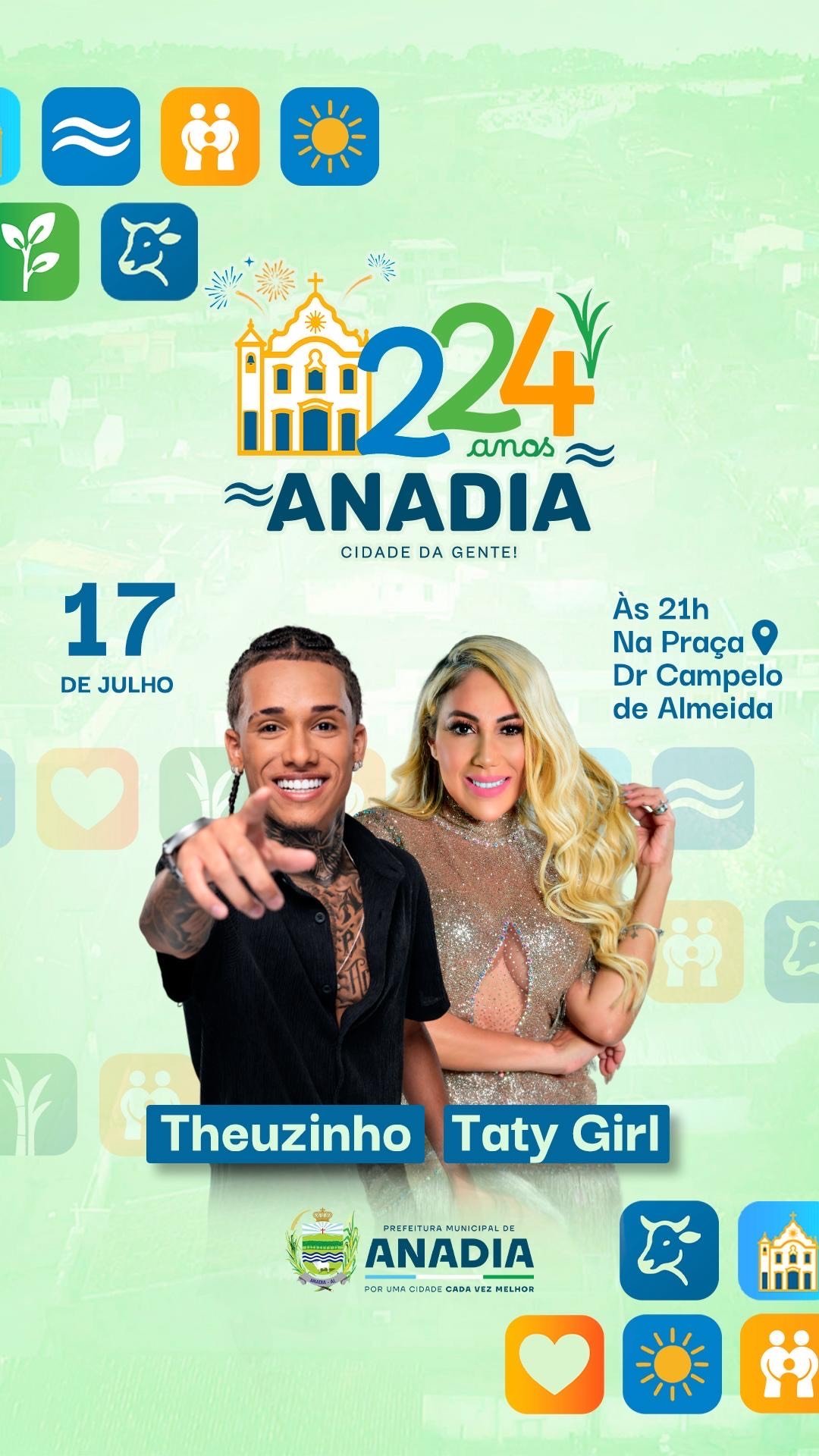 No dia 18 de julho, o município de Anadia completará 224 anos de história; e, para celebrar a data, a prefeitura acaba de anunciar a programação artística da festividade. No dia 17, os anadienses e visitantes curtirão muita música e animação ao som de Theuzinho e Taty Girl.