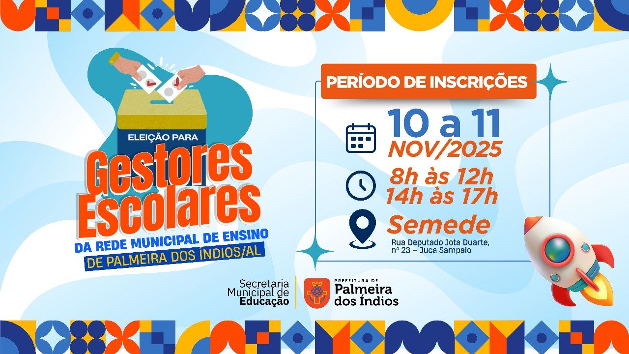 A Prefeitura de Palmeira dos Índios, por meio da Secretaria Municipal de Educação, Esporte, Lazer e Juventude (Semede), tornou público o edital (acesse o documento aqui) que regulamenta o Processo Seletivo Interno e Eleitoral para a escolha de diretores(as) e diretores(as) adjuntos(as) das unidades escolares da Rede Pública Municipal de Ensino. O processo segue os princípios da gestão democrática, da transparência e da valorização dos profissionais da educação, conforme previsto na Lei Municipal nº 2.461/2022 e no Decreto Municipal de 20 de outubro de 2025 e o prazo para a realização de inscrições acontece entre os dias 10 e 11 de novembro.