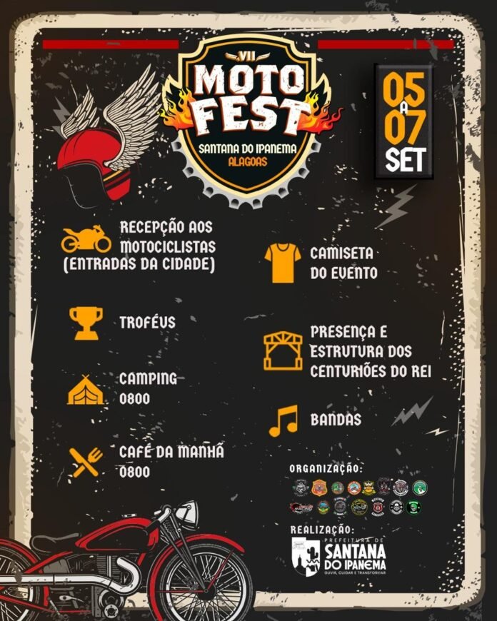 A Prefeitura de Santana do Ipanema divulgou nesta quinta-feira (31), por meio de suas redes sociais, a programação oficial do VII Motofest, que será realizado nos dias 5, 6 e 7 de setembro, no Centro de Convivência, no Largo Cônego José Bulhões.