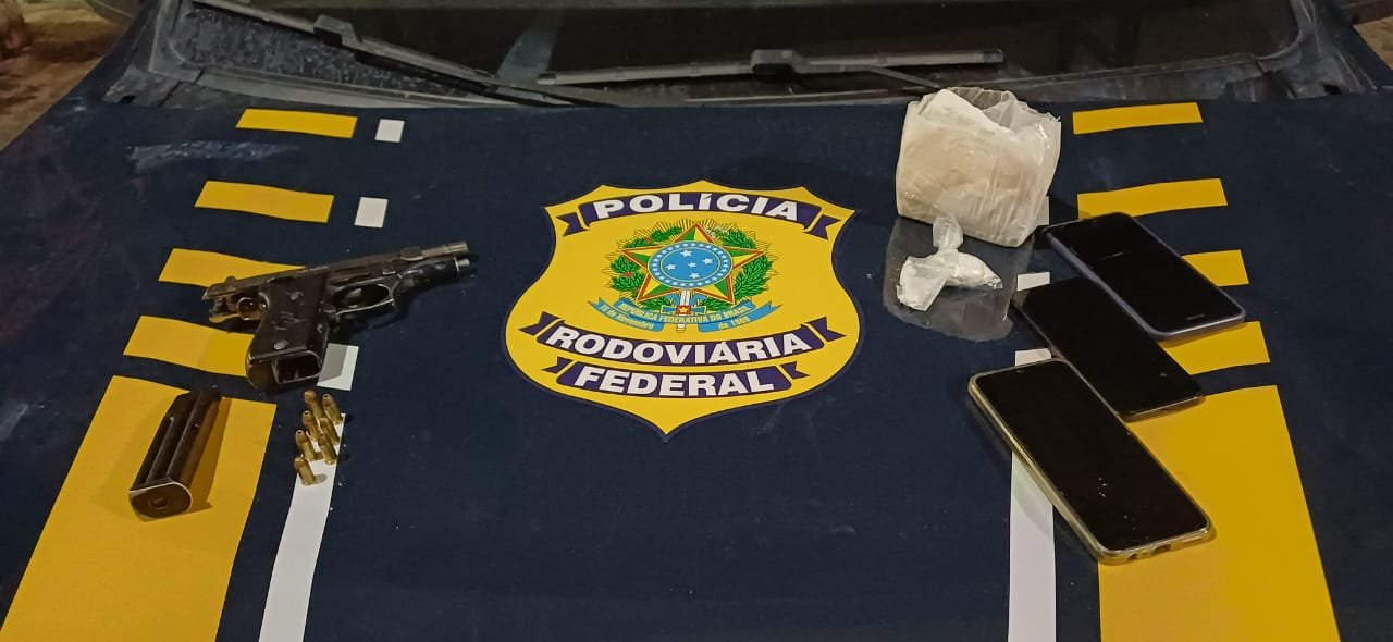 Durante a ação da PRF foram apreendidas 7 munições intactas calibre 7.65mm, uma pistola calibre 7.65mm e 500g de cocaína.