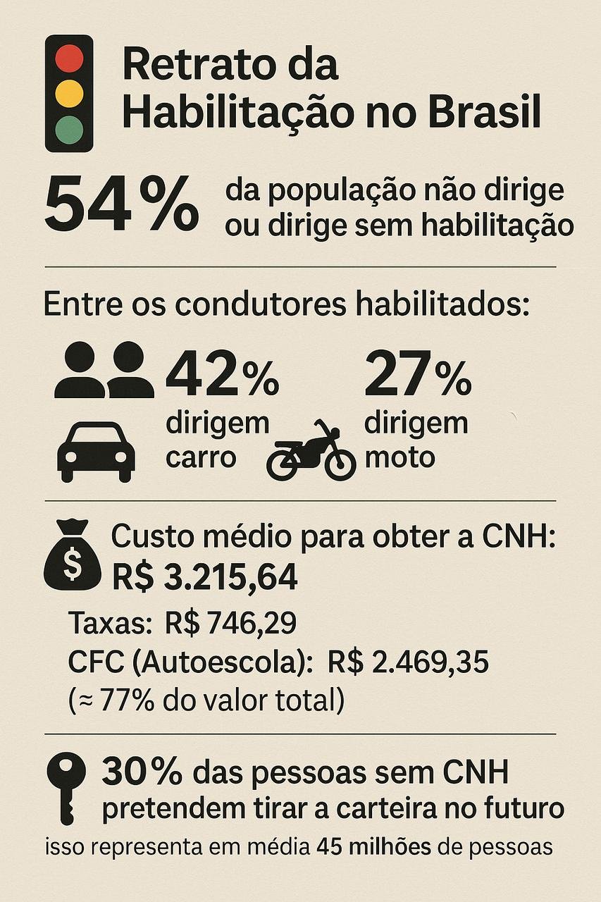Mas, com um valor que ultrapassa os R$3 mil, para muitos brasileiros a CNH é algo inacessível. Prova disso é que, atualmente, cerca de 40 milhões de brasileiros estão em idade legal para dirigir, mas muitos ainda não possuem habilitação, em grande parte devido ao alto custo do processo atual.