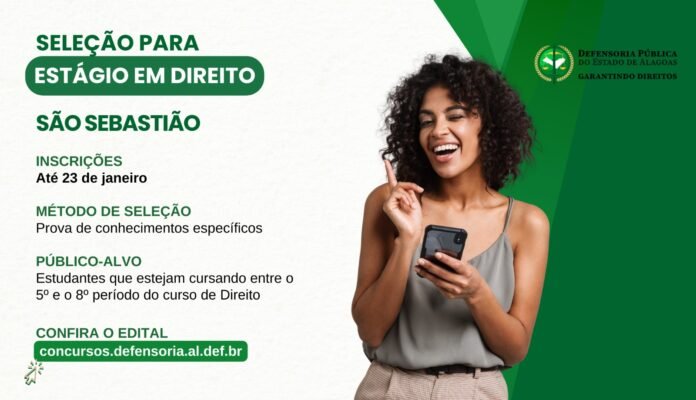 A Defensoria Pública do Estado de Alagoas (DPE/AL) abriu seleção para estágio em Direito no município de São Sebastião. As inscrições vão até 23 de janeiro e devem ser realizadas pela plataforma concursos.defensoria.al.def.br.