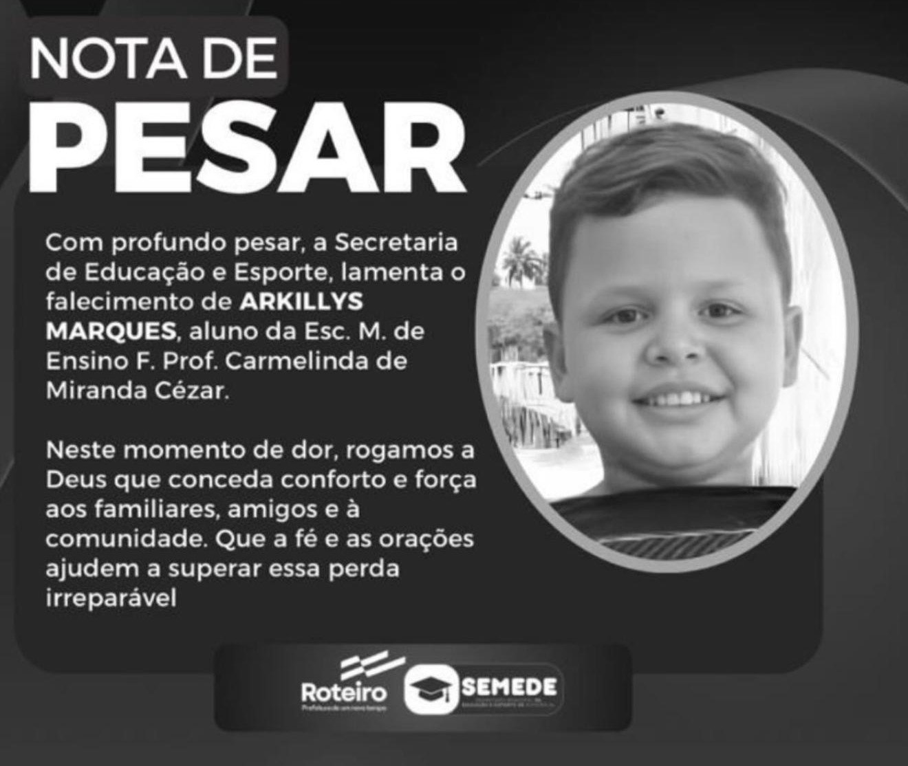 A Secretaria de Educação e Esporte de Roteiro emitiu nota de pesar pela morte do menino Arkyllys Marques, que morreu após ser soterrado por uma barreira na tarde desta quinta, 19, na cidade de Roteiro, Litoral Sul do Estado. Arkyllys era aluno da Escola Professora Carmelinda de Miranda Cézar.