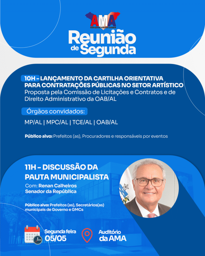 A Associação dos Municípios Alagoanos (AMA) realiza, na próxima segunda-feira (05), mais uma tradicional reunião entre prefeitos e prefeitas. O encontro acontecerá a partir das 10h, no auditório da instituição. O senador da República, Renan Calheiros, confirmou participação no segundo ponto de pauta, às 11h, para uma discussão de assuntos municipalistas e os principais desafios enfrentados pelas gestões locais.