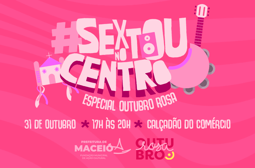 O Calçadão do Comércio será tomado por muita música, alegria e energia feminina nesta sexta-feira (31), com mais uma edição do Sextou no Centro, promovida pela Fundação Municipal de Ação Cultural (FMAC), em parceria com a Secretaria Municipal de Saúde (SMS). O evento, que já se consolidou como um dos mais queridos da programação cultural da capital, ganha nesta edição um tom especial em alusão ao Outubro Rosa, campanha mundial de conscientização sobre a prevenção e o diagnóstico precoce do câncer de mama.