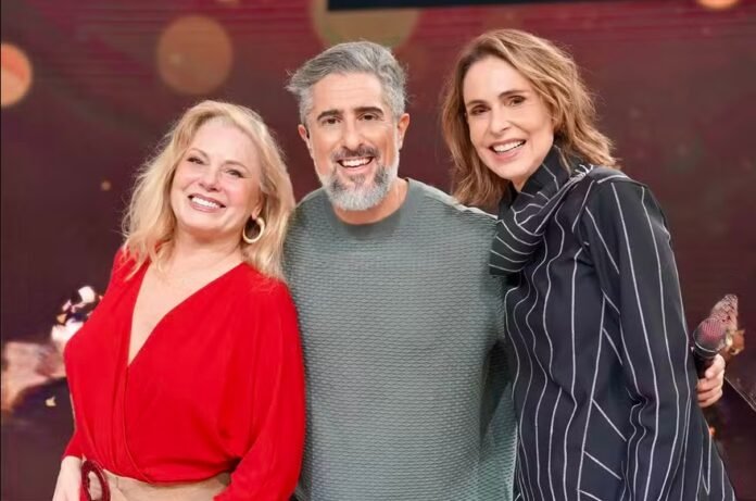 Celebrando a memória da TV Globo, Marcos Mion recebe as atrizes Vera Fischer e Silvia Pfeifer no TV Teca, especial Novelas, no ‘Caldeirão com Mion’ — Foto: Trouva/Rede Globo