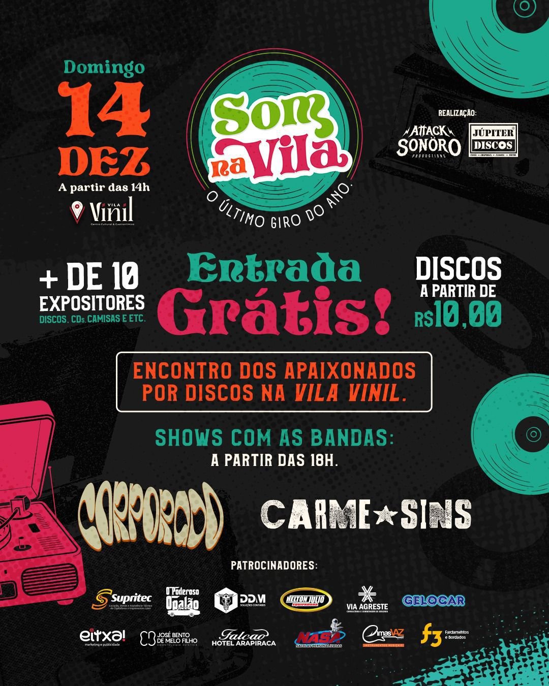 Além de diversos expositores de Arapiraca e Maceió — como Alex CDs, TNT Discos, Júpiter Discos, Ginga Discos, Solar Discos, Sorte Discos, Radiola 3×1, Bolinho Discos, DZ Discos, Zona Morta Discos e Relivro —, irão acontecer shows gratuitos com as bandas Corporado (Arapiraca/Sergipe) e Carmesins (Arapiraca), com apresentações musicais a partir das 18h.