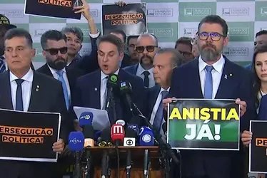 Oposição em entrevista coletiva em defesa da anisita ao 8 de janeiro. Foto: Captura/YouTube