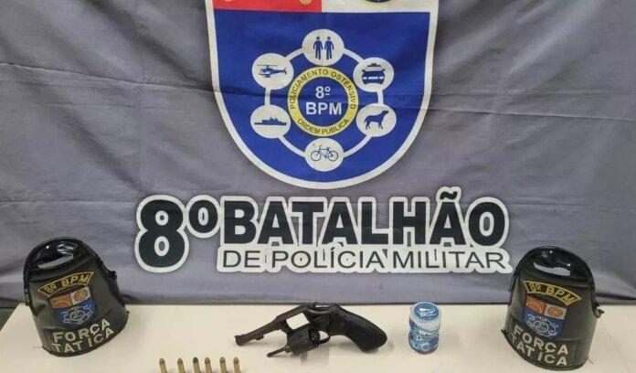 Durante o cumprimento de um mandado de busca e apreensão, o suspeito tentou se livrar do revólver, jogando-o pela janela da própria casa. Em seguida, os agentes localizaram entorpecentes e uma balança de precisão sobre a geladeira, reforçando as suspeitas de envolvimento com o tráfico de drogas.