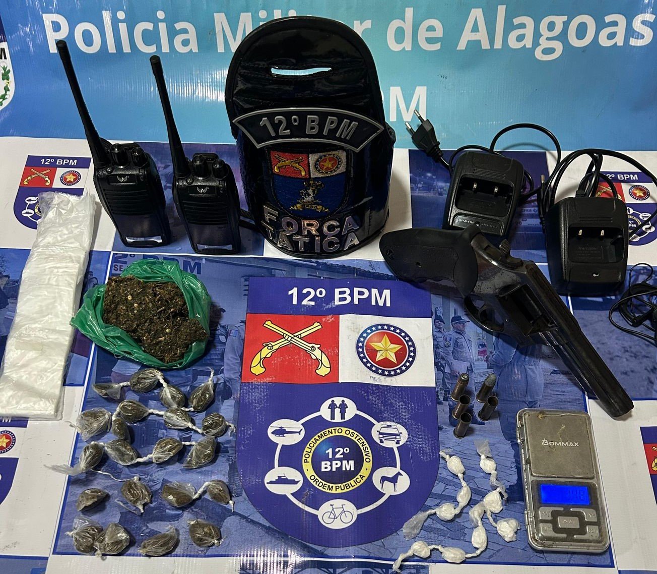No local onde ele estava, no conjunto São Caetano foram apreendidos um revólver calibre 38 com duas munições intactas e três deflagradas e uma quantidade de maconha e cocaína, além de uma balança de precisão.