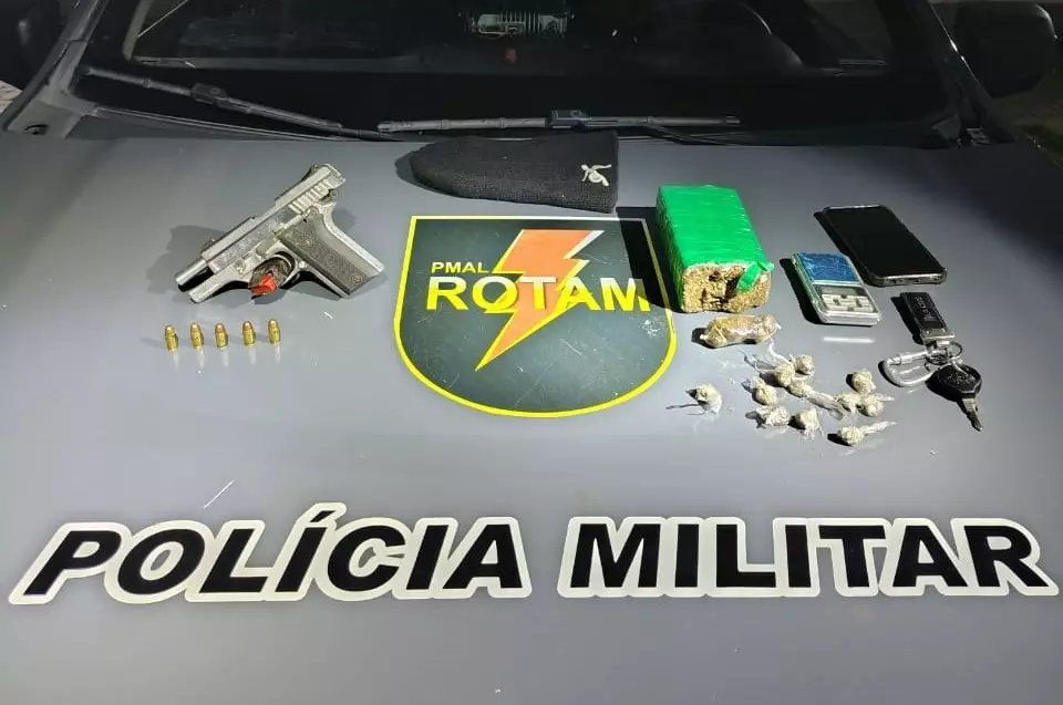 Por volta das 23h, no conjunto Jardim Royal, duas pessoas foram presas e encaminhadas à Polícia Civil. Com elas, os policiais militares apreenderam uma pistola calibre 380 com cinco munições intactas, 520 gramas de maconha e uma balança de precisão, além de um aparelho celular e um automóvel.
