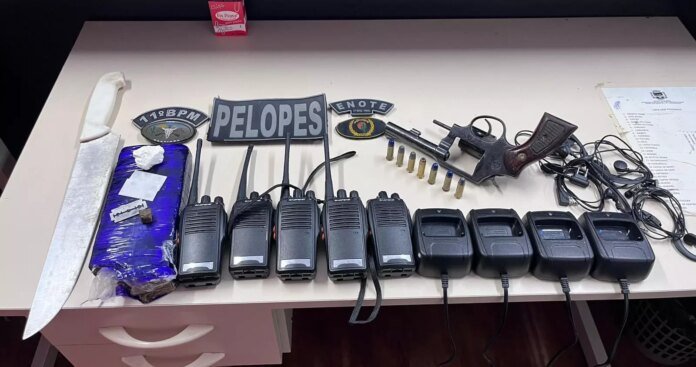 Durante a ação, os policiais encontraram no local um revólver calibre 38, drogas, munições, rádios de comunicação, facas e fones de ouvido.