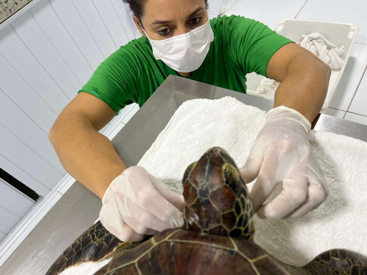 A tartaruga-verde (Chelonia mydas) é uma espécie considerada ameaçada de extinção, o que reforça a importância de ações rápidas de resgate e reabilitação.