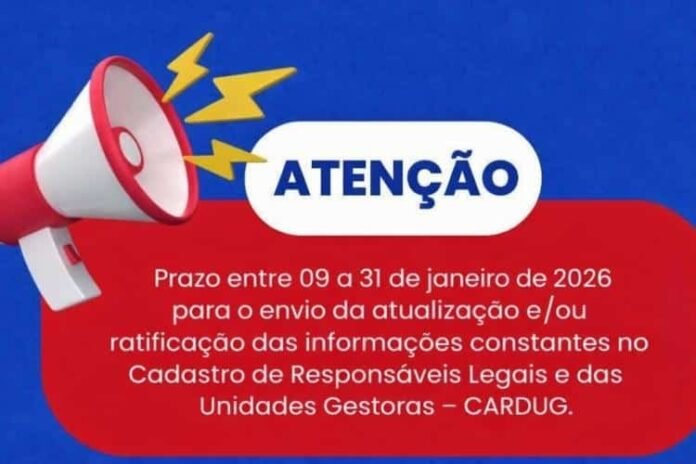O Tribunal de Contas do Estado de Alagoas (TCE/AL), determinou que as Unidades Gestoras e seus responsáveis legais atualizem ou ratifiquem as informações no Cadastro de Responsáveis Legais e das Unidades Gestoras (CARDUG) entre os dias 9 e 31 de janeiro de 2026.