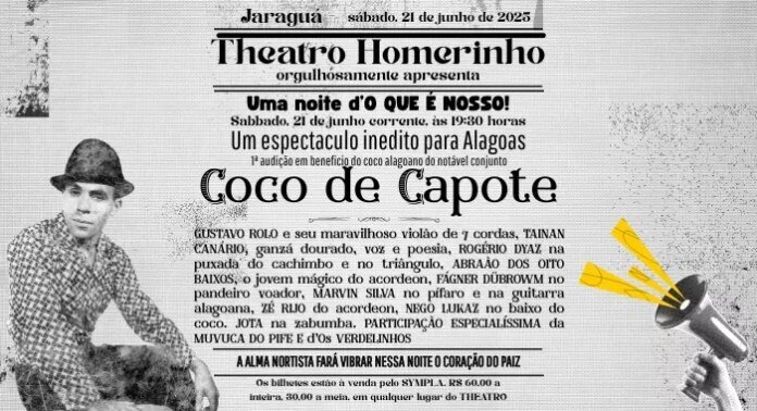 O Theatro Homerinho, em Maceió, será palco no próximo dia 21 de junho, a partir das 19h30, de uma noite dedicada ao ritmo, à poesia e à tradição popular nordestina. O espetáculo “Coco de Capote – Noite dos Cocos e Emboladas” promete uma verdadeira viagem pela história e pela força cultural do coco, ritmo profundamente enraizado nas manifestações populares do Brasil.