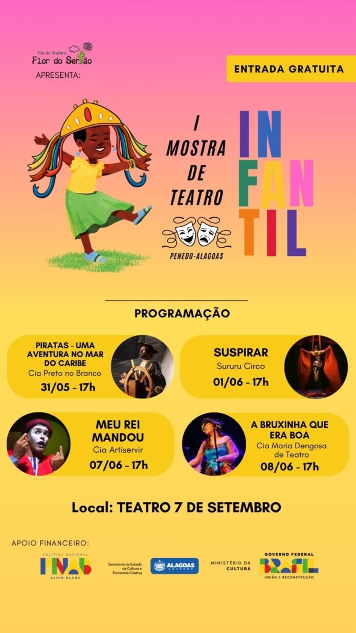 A 1ª Mostra de Teatro Infantil acontece nos finais de semana, entre os dias 31 de maio e 8 de junho, graças à Política Nacional Aldir Blanc do governo federal, viabilizada através do Ministério da Cultura e operacionalizada pelo Governo de Alagoas, por meio da Secretaria de Estado da Cultura e Economia Criativa (Secult).