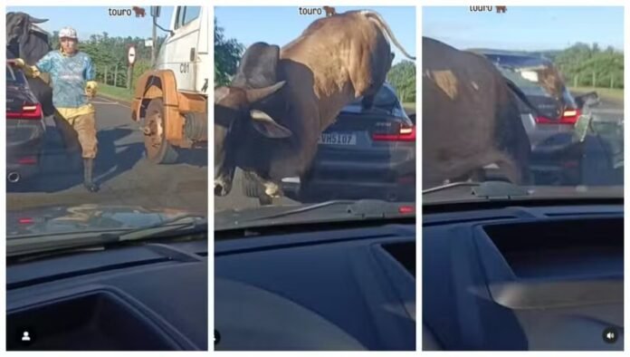 “O touro está solto, acho que teve algum acidente com ele, e ninguém passa, por causa do touro”, disse ela, no vídeo, antes de ver o animal correr na sua direção.