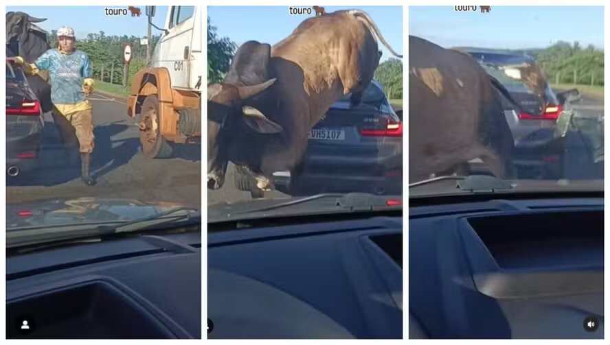 Um caso inusitado e perigoso ocorreu na manhã desta sexta-feira (11) em Ribeirão Preto. Um touro que estava solto em uma rodovia movimentada da Zona Sul da cidade saiu em disparada e pulou por cima de um carro de luxo, da marca BMW, deixando o veículo bastante danificado. O momento foi filmado pela produtora de eventos Paula Zeotti, que dirigia o automóvel que vinha logo atrás e também teve o seu carro atingido.