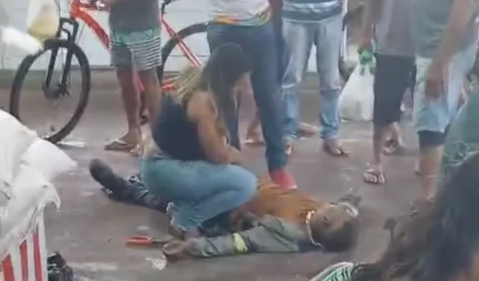 Após o acidente, o trabalhador permaneceu deitado no solo e foi amparado por populares que presenciaram o ocorrido.