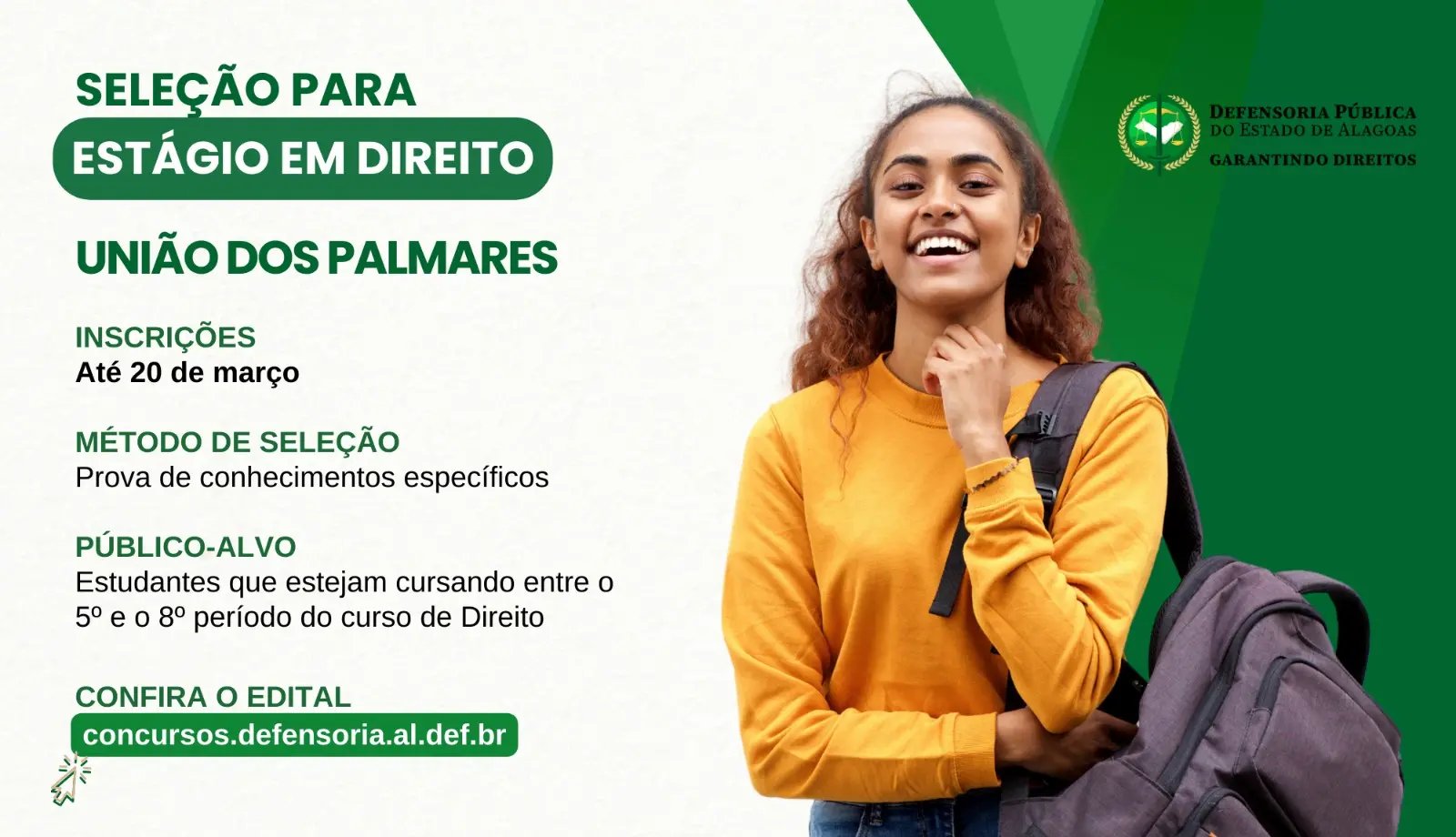 A Defensoria Pública do Estado de Alagoas (DPE/AL) abriu seleção para estágio em Direito no município de União dos Palmares. As inscrições seguem até o dia 20 de março e devem ser realizadas através da plataforma concursos.defensoria.al.def.br.