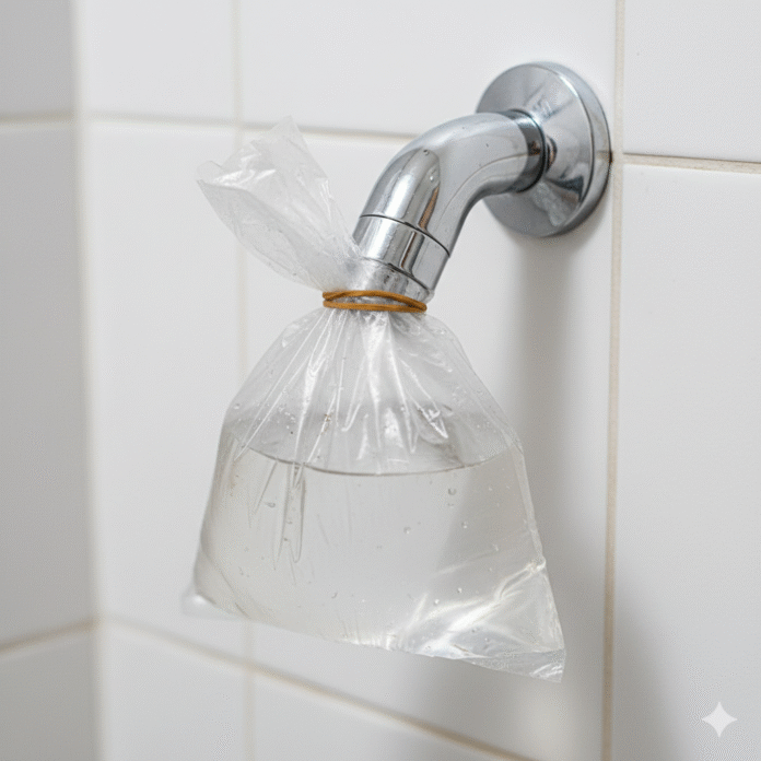2️⃣ A Fixação: Envolva o bocal do chuveiro com o saco, garantindo que todos os buraquinhos fiquem mergulhados no líquido.