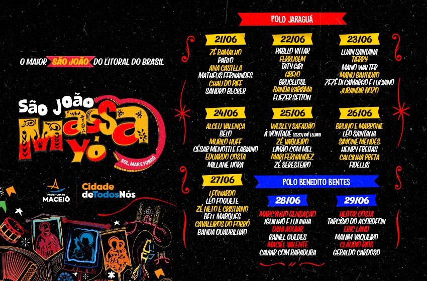 O maior São João do litoral do Brasil começa dia 21 de junho. O prefeito de Maceió, JHC, anunciou a programação oficial do São João Massayó 2025. O evento acontecerá de 21 a 27 de junho no Polo Jaraguá, e nos dias 28 e 29 de junho no Polo Biu.