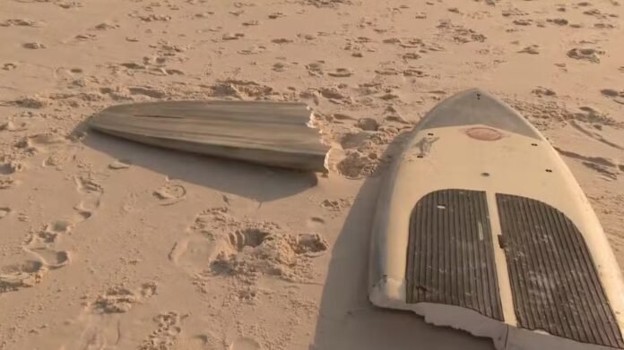 Por conta da ventania, uma prancha de stand-up paddle chegou a quebrar ao meio — Foto: Reprodução/TV Globo