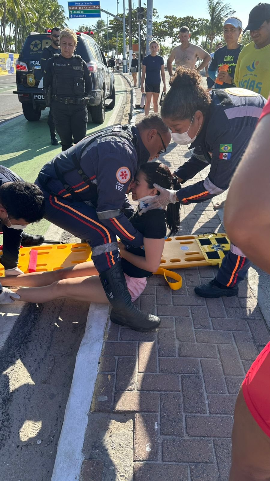 Uma equipe do Samu, além de agentes da Oplit prestam atendimento à jovem, que foi encaminhada para atendimento hospitalar. Momentos antes do incidente, a própria amiga mostra ambas correndo da orla.