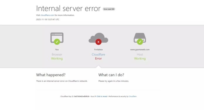 Ao acessar o X, alguns usuários se depararam com uma mensagem de erro da Cloudflare (veja na imagem abaixo). O ChatGPT também exibiu notificações de falha associadas a instabilidades da empresa, o que sugere que os problemas podem estar relacionados à Cloudflare, embora a causa ainda não tenha sido confirmada.